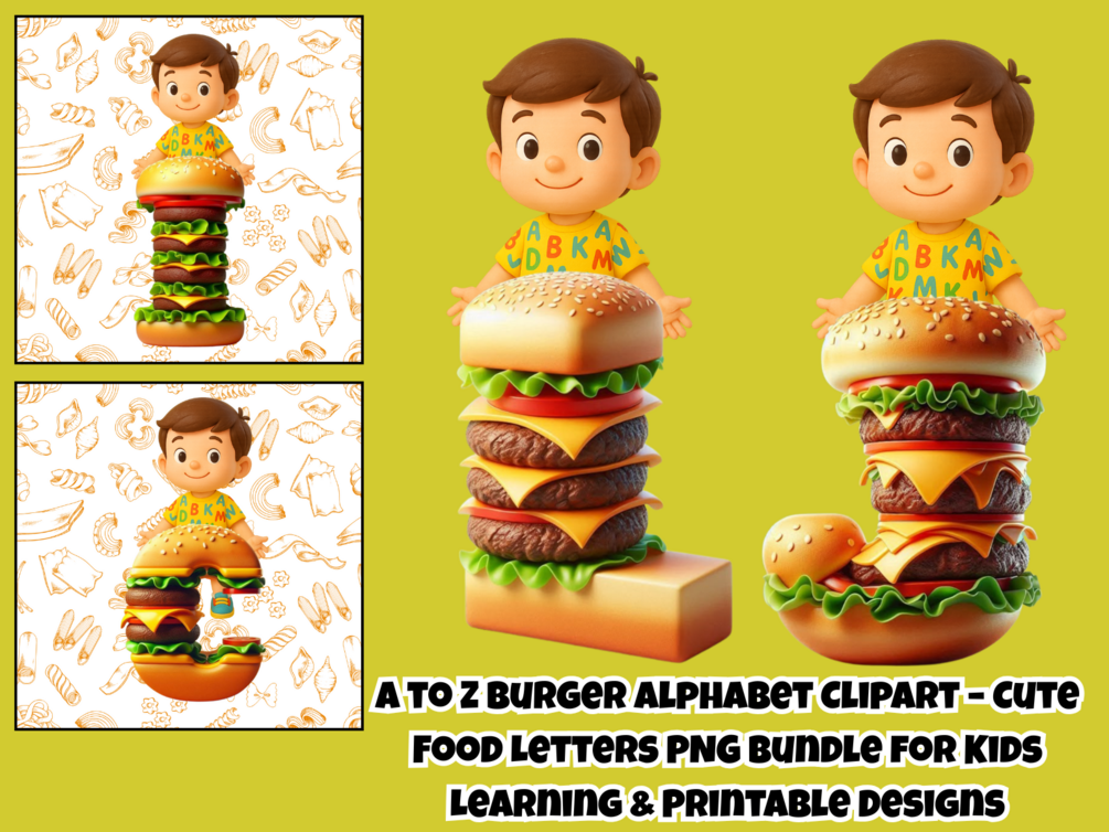 “Download this adorable A to Z burger-themed alphabet clipart bundle featuring two versions: high-quality PNGs with transparent backgrounds and PNGs with a fun food-themed background including burgers, fries, donuts, and more. Perfect for kids educational resources, nursery wall art, printable flashcards, learning posters, stickers, and sublimation projects. Each letter is designed in a playful cartoon burger style, ideal for teachers, parents, and creators looking to add a cute food aesthetic to their educational designs.”