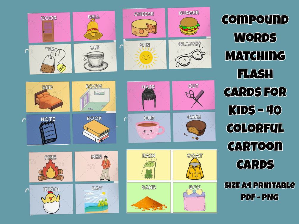 Compound Words Matching Flashcards for Kids – 40 Colorful Cartoon Cards – English– A4 Printable PDF - PNG