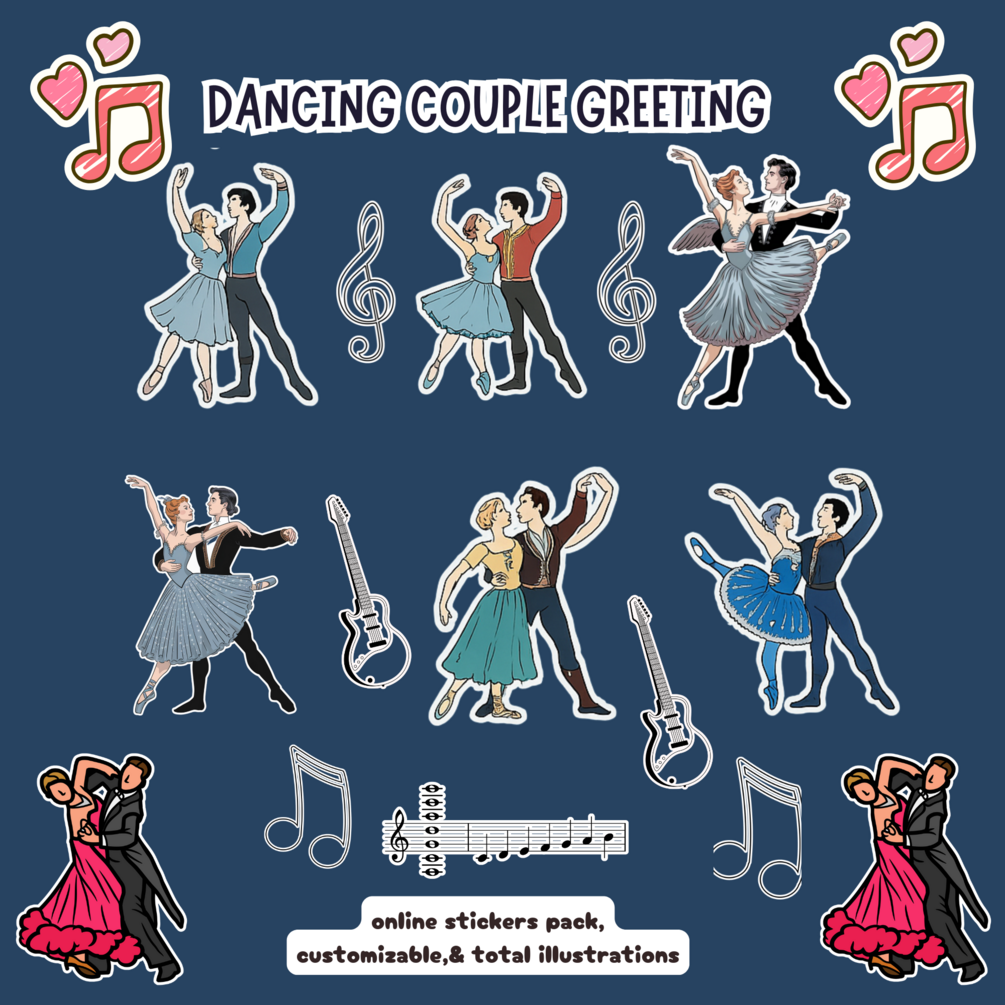 This beautifully illustrated “Dancing Couple Greeting” digital sticker pack includes 18 unique designs of couples dancing in elegant and playful styles. Each sticker is created with detail, making it perfect for: