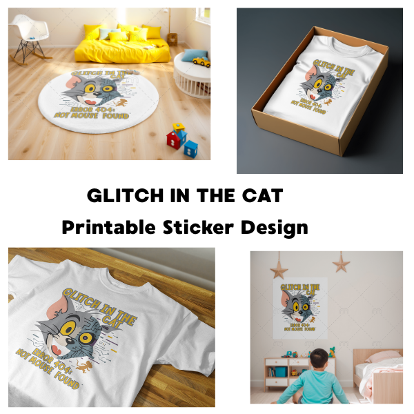 "GLITCH IN THE CAT ⚡ ERROR 404: MOUSE NOT FOUND Printable Sticker Design