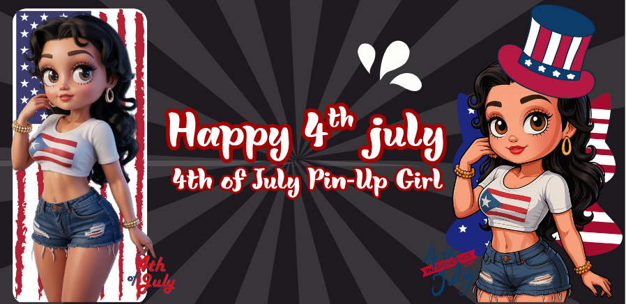Adorable patriotic pin-up girl in chibi style with USA flag crop top and denim shorts – perfect for 4th of July stickers, printables, T-shirts, and party decor.