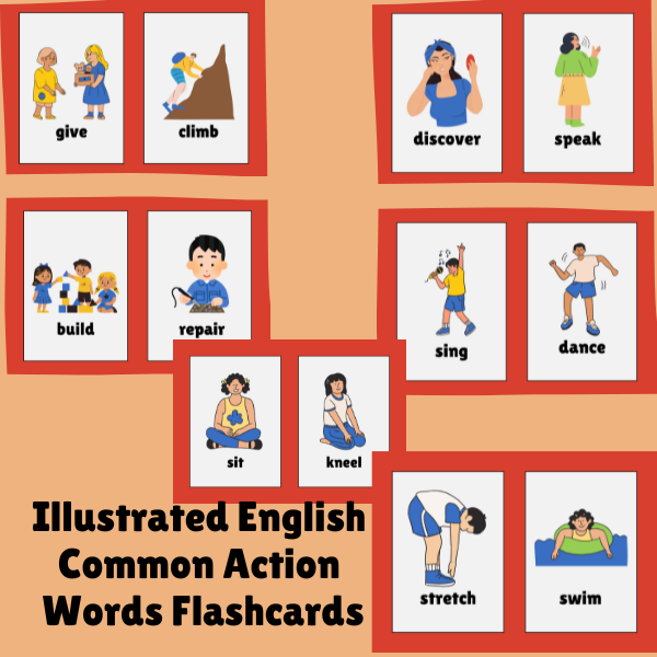 Make learning fun and easy with these Illustrated English Common Action Words Flashcards! Designed for young learners, these colorful and engaging cards help children understand and memorize common action words like "give," "climb," "sing," "swim," and more.