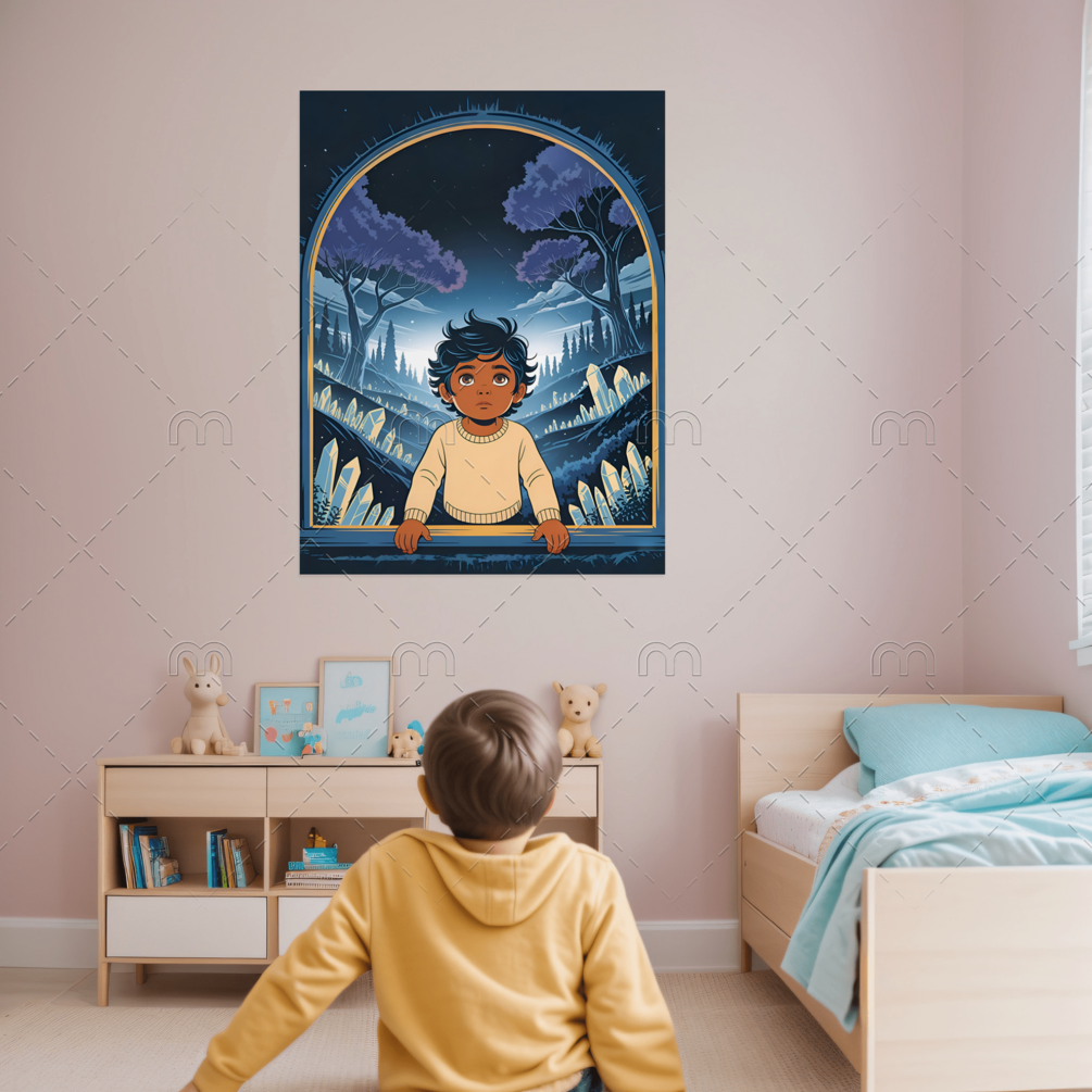 Step into a magical realm through the eyes of a child. "Window to a Dreamworld" is a beautifully illustrated fantasy art print capturing the innocence and curiosity of a young boy gazing into a mystical crystal landscape under a starry sky. Perfect for children’s rooms, nurseries, or anyone who cherishes dreamlike art. This print blends wonder, nature, and imagination into one enchanting scene.